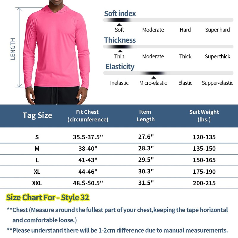 - Hooded Long Sleeve Workout Shirts:Heather colors fabric is medium-weight polyester/spandex jersey.Solid color combos are made of lightweight pure polyester jersey. So, the size charts for these two fabrics are different. Please refer to the size chart on the left for each color.