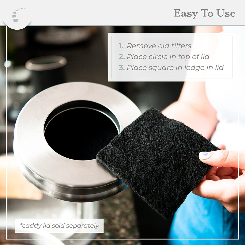 • 🌱 EASY TO USE - Remove old filters. Place round filter in first to cover ventilation holes in top of lid. Place square filter second in ledge of lid to completely block entrance of bin. Replace every 4-6 months or when filters have a strong smell.