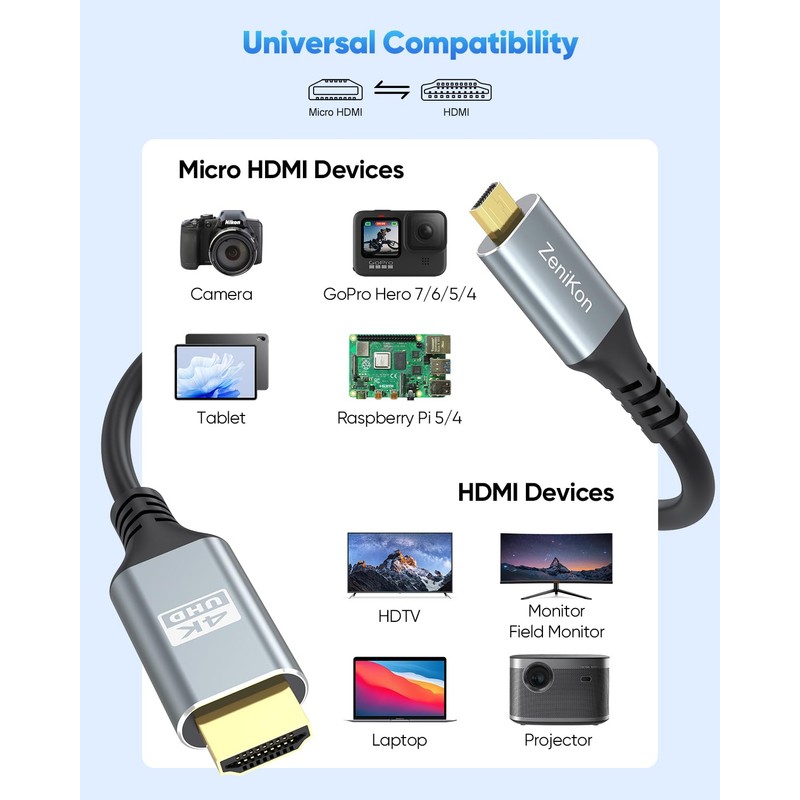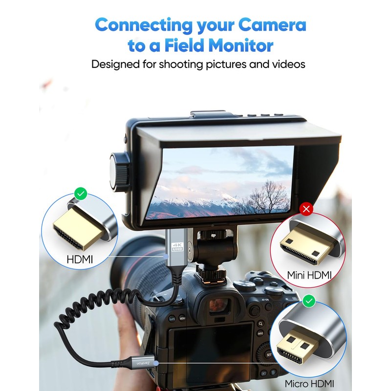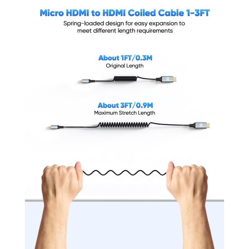 • Micro HDMI Coiled Cable for Cameras to Field Monitor: Innovative Micro HDMI to HDMI Coiled Cable 1FT-3FT is designed specifically for the camera and field monitor, supports 4K@60Hz resolution, HDR and Audio Return Channel (ARC). Also compatible with Raspberry Pi 5/4, tablets with micro hdmi ports, etc