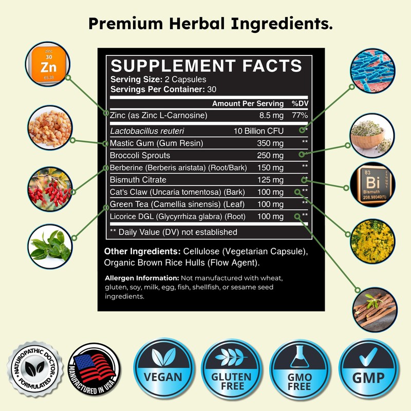 - An herbal blend containing Lactobacillus Reuteri - 10 billion CFU of this highly beneficial micro-organism may be effective in providing support against digestive issues. Also contains: Zinc, Mastic Gum, Berberine, Licorice DGL and more.