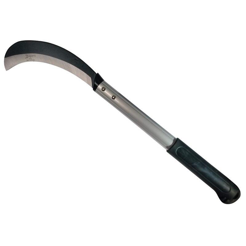 The Zenport K315 brush clearing sickle with 14 5" Aluminum handle & 8" High carbon steel blade is designed for heavy duty clearing & scrubbing of tough vines, weeds, undergrowth & small saplings. Black soft rubber grips & the 14 5" Aluminum tube handles allows maximum leverage & force. Razor sharp 8" Carbon steel straight edge hooked blade provides powerful cuts & for cutting stems, stalks & branches. Also makes a great knife for harvesting a variety of fruits & berries, & vegetables. Overall tool length measures 22 5".