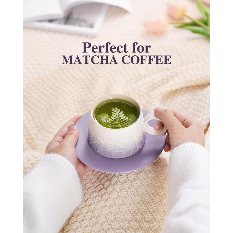 - COMFORTABLE HANDLE & WIDE STABLE BASE: Our cappuccino cups come with a Q shape handle for a comfortable grip. aslo design with the practical features of the wide base that offering more stability, you never have to worry about the cups tipping over easily. The stylish flat, lavender color coffee saucer holds cups securely and is large enough to hold biscuits while keeping the table tidy.