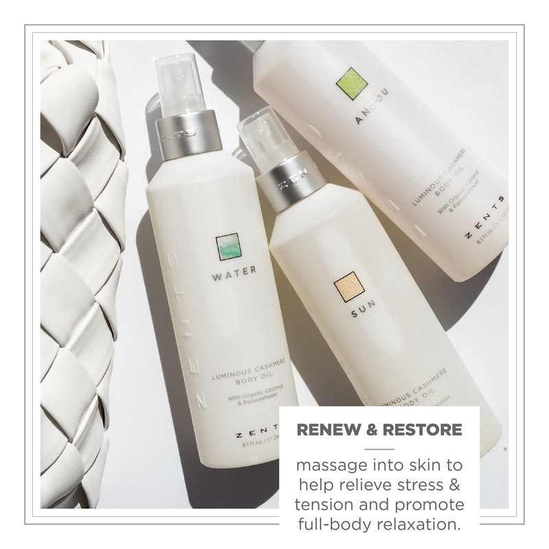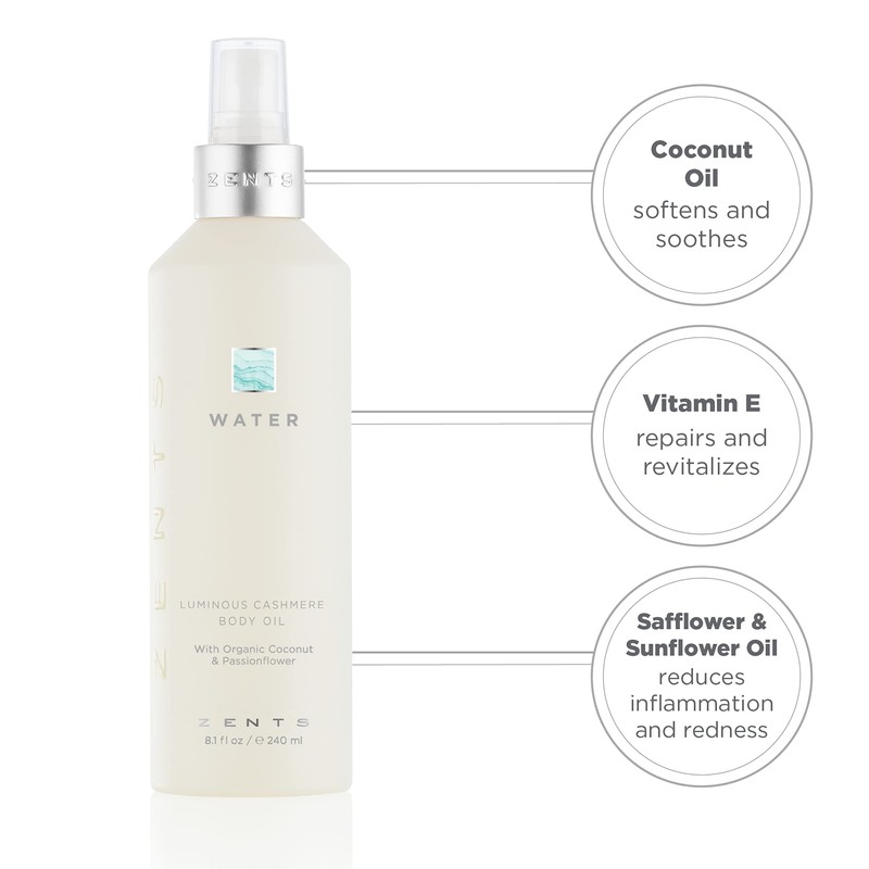Zents Luminous Cashmere Body Oil, Soften and Moisturize Skin with Vitamin E and Organic Coconut Oil, 8 fl oz / 240 ml (Water)