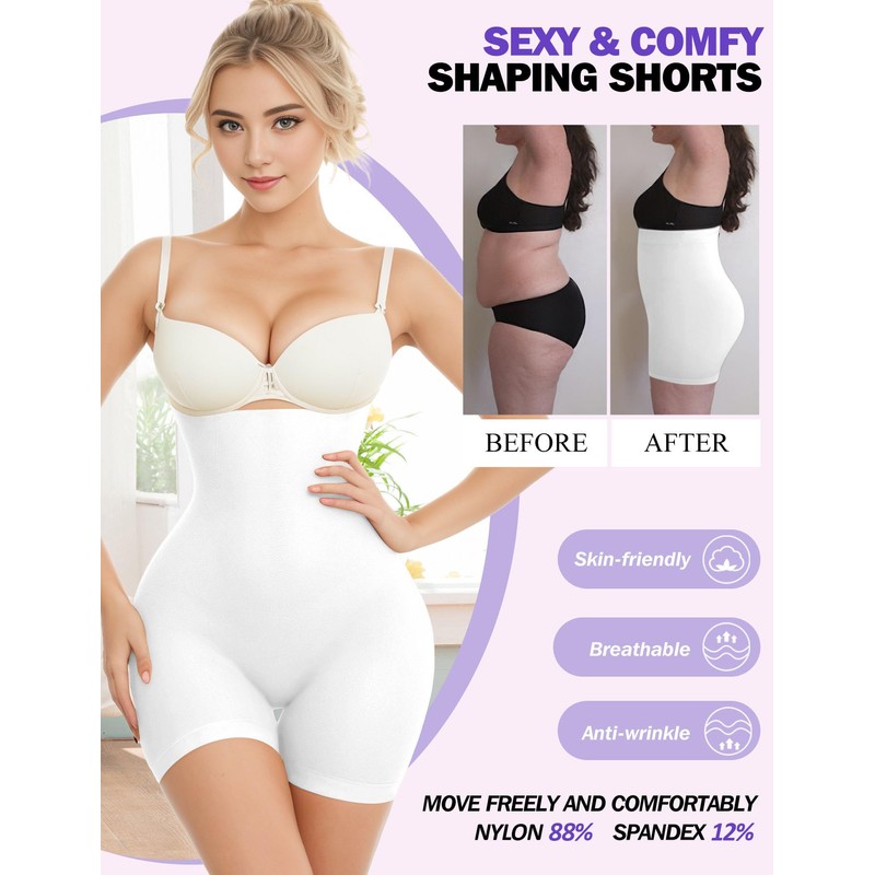 - CONFIDENCE-BOOSTING SHAPER SHORTS for WOMEN: Our waist and tummy slimmer shorts were made for comfortable everyday wear! Body shaper tummy control can be worn under all types of clothing to smooth your torso, shape curves to own a better figure, and it does not bind or hinder movement in any way and provide comfort all day long. Shapewear for women tummy control is made from 88% Nylon and 12% Spandex, which is lightweight and breathable, and provides 360-degree stretch without any added bulk