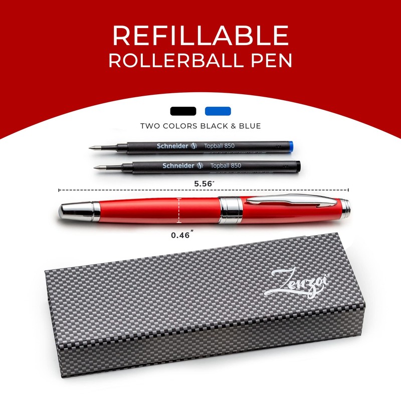 - THE ROYAL STANDARD IN PENMANSHIP- Created to cater to a highly demanding audience, the elegant ZenZoi luxury rollerball pen brings together finesse and functionality, into a timeless writing piece. Minimalistic design elements combine on a brass metal body with a lacquered red and silver scheme, for the ultimate writing experience.