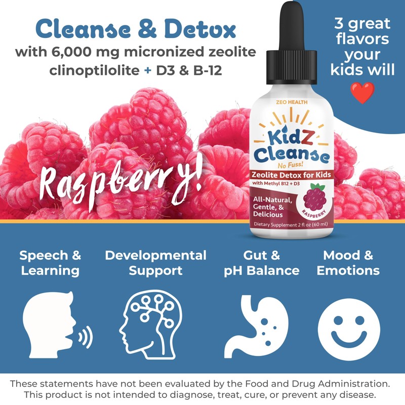 Kidz Cleanse | Zeolite Detox for Kids | Development, Behavior, Energy and Gut Health Support Supplement | Easy to Take, Pure Liquid Zeolite Drops + Methyl B12 + D3 (Raspberry Flavor) - 2oz