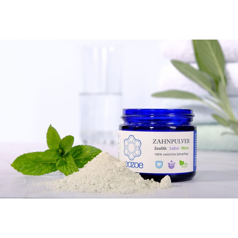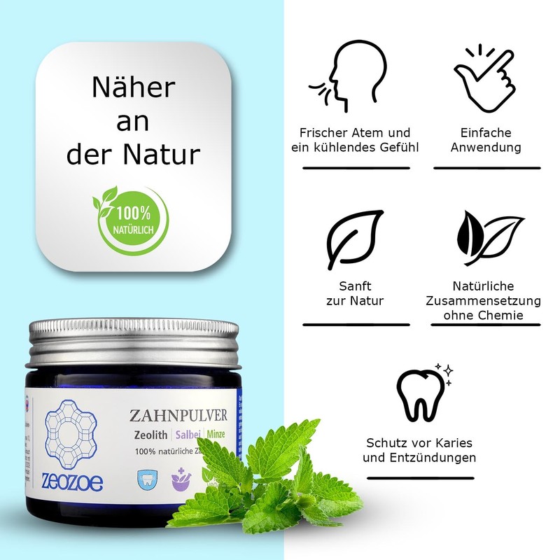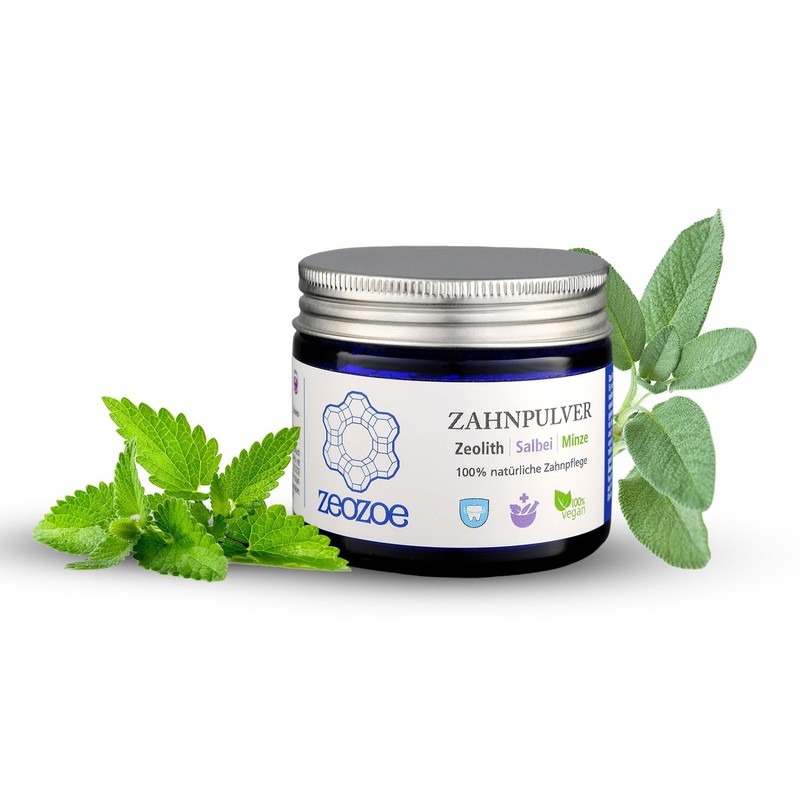 - Schon vor Tausenden von Jahren putzten sich die Menschen die Zähne mit feinen Pulvern (vor allem im Orient). Heute wird diese Art der Zahnreinigung wiederentdeckt. Unser Produkt nutzt die außergewöhnlichen Eigenschaften von pulverisiertem natürlichen Zeolith. In Verbindung mit Salbei und Minze reinigt es nicht nur, entfernt Plaque und Zahnstein, sondern beugt auch Karies und Zahnfleischentzündungen vor. Die sanft abrasive Eigenschaft von Zeolith verursacht keine Schäden am Zahnschmelz.