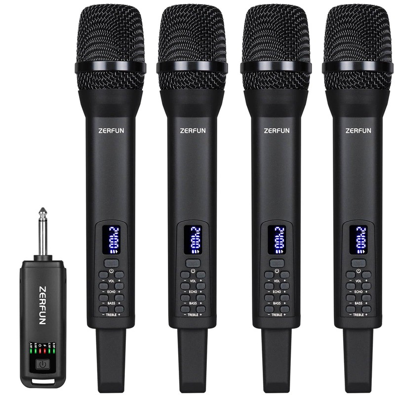 - Here are four ZERFUN rechargeable wireless microphones! They are equipped with independent controls for volume, echo, treble, and bass. They are the perfect choice for home karaoke, meetings, parties, churches, DJ events, weddings, and so many more applications! These well-made cardioid wireless mics have the ability to pick up noise unidirectionally(Only when we speak towards the top of the microphone will there be a sound, while there will be no sound when speaking on the side). With this pickup pattern, the directional vocals can be effortlessly separated from the background noise.
