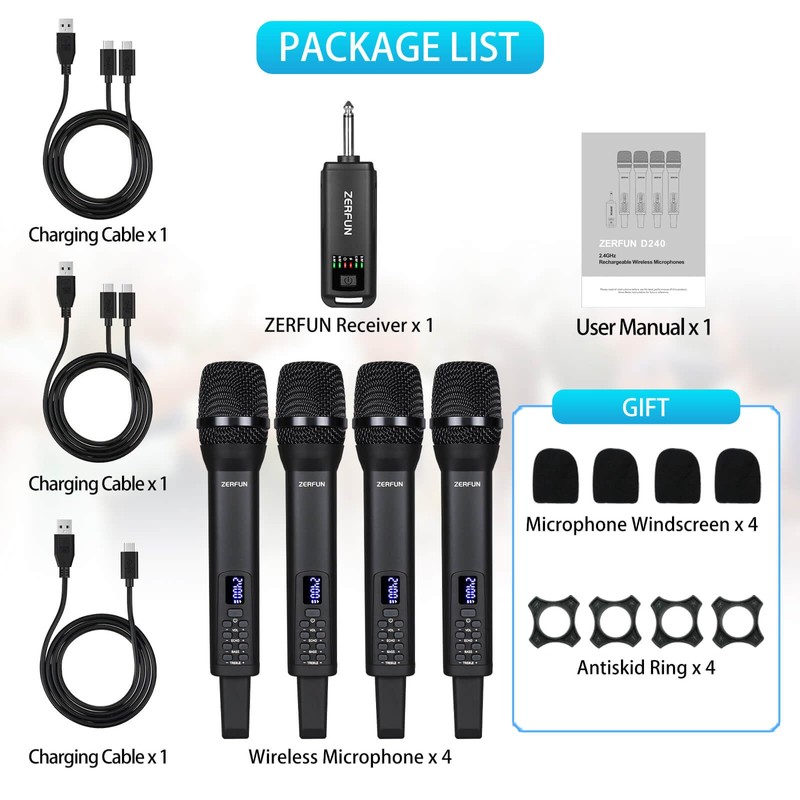 - Package List Includes: ZERFUN rechargeable wireless microphones x4; receiver x1; charging cable x3; microphone windscreen x4; antiskid ring x4; user manual x1. Genuine ZERFUN Wireless Microphone products come with supportive 24-Hours After-Sales Customer Service, 12-Month Manufacturer Assurance.