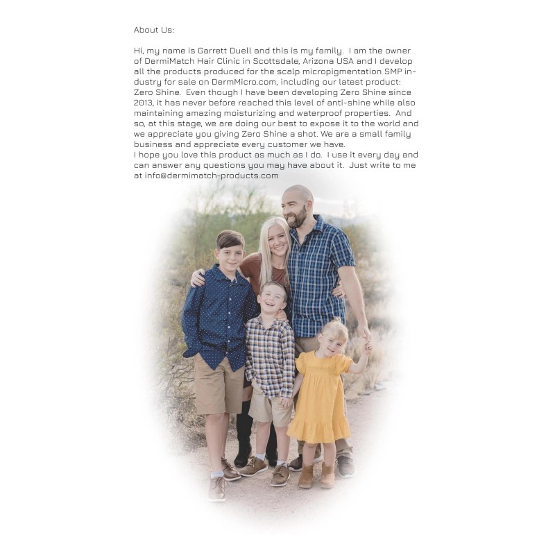Zero Shine represents the mattification determination of creator, Garrett Duell, of DermMicro Scalp Products. Over the course of 7 years, Garrett tried hundreds of variations of Zero Shine before finally creating the version before you today. Zero Shine sets out to be, and currently is, the most mattifying skin cream on the market. Its anti-shine properties are unmatched while still maintaining the ability to moisturize and nourish your scalp skin.