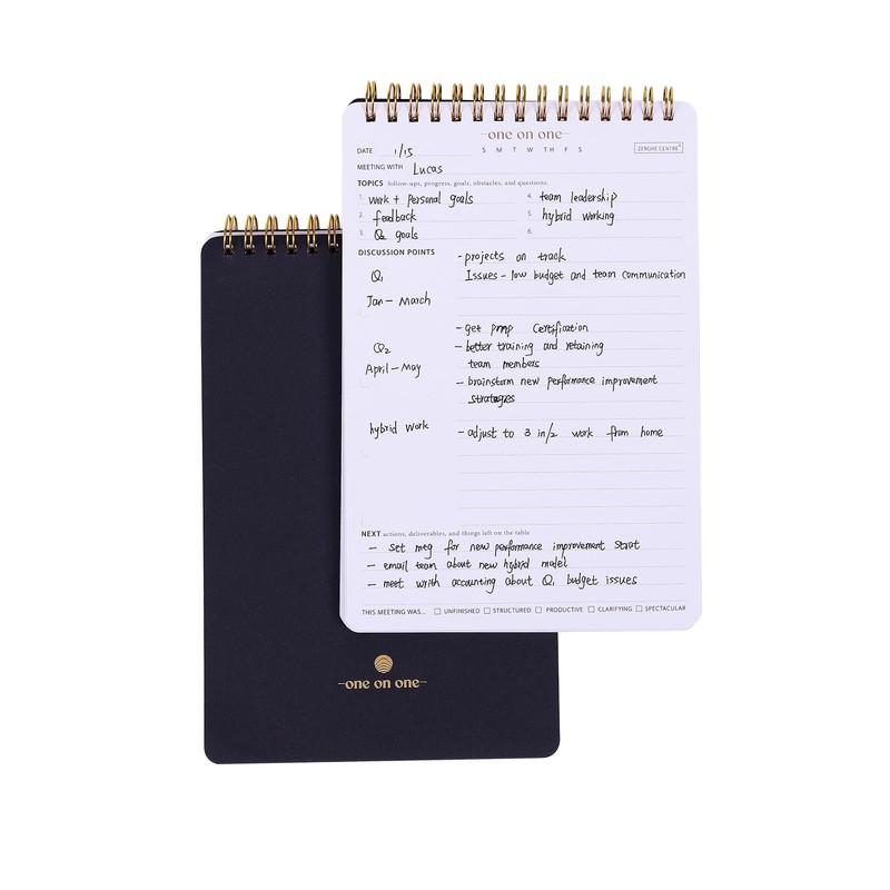 - INVALUABLE - This 1:1 spiral conference notepad is invaluable at keeping the notes organized and easy to refer back to from meeting to meeting. Effective meetings are a huge part of being successful–especially meetings with your employees or your boss. Streamline your business meetings and note-taking process with this efficient notebook.