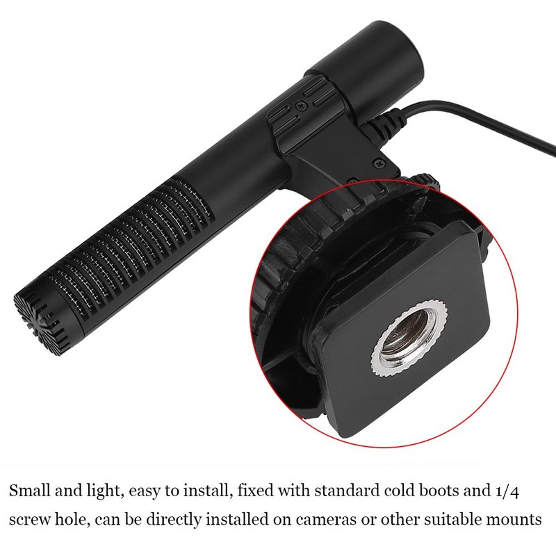 • Fácil de instalar: el micrófono de la cámara es pequeño y ligero, que se fija con botas de frío estándar y agujero de tornillo de 1/4, se puede instalar directamente en cámaras u otros soportes adecuados.
