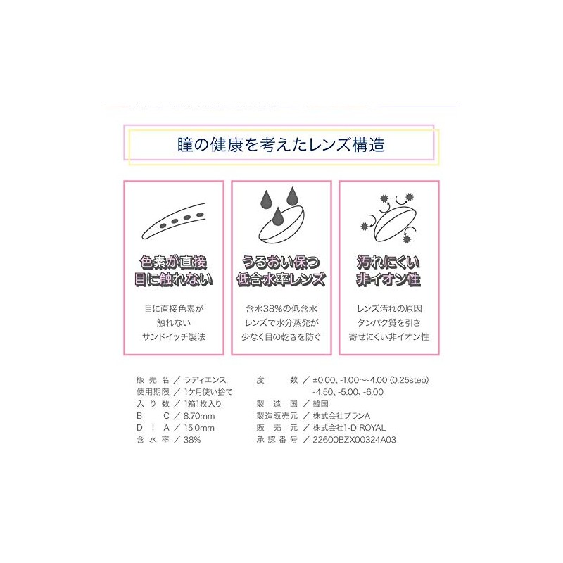 - ・販売名:ラディエンス ・使用期限:1ケ月使い捨て ・入り数:1箱1枚入り ・BC:8.70mm ・DIA:15.0mm ・含水率:38% ・度数:±0.00,-1.00~-4.00(0.25step),-4.50,-5.00,-6.00 ・製造国:韓国 ・製造販売元:株式会社プランA ・販売元:株式会社1-D ROYAL ・承認番号:22600BZX00324A03