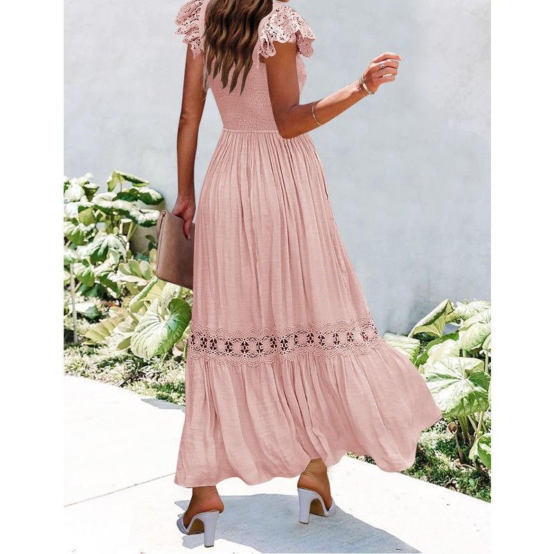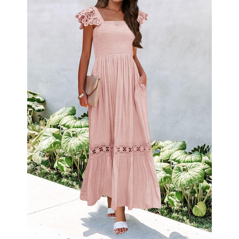 ZESICA Women's 2024 Summer Lace Strap Sleeveless Square Neck Smocked High Waist Ruffle Hollow Out Flowy A Line Maxi Dress,Pink,Small