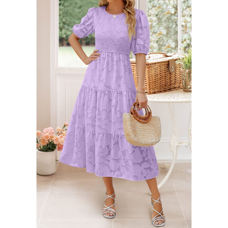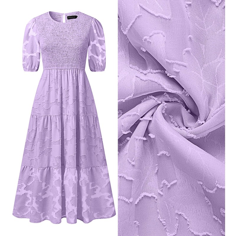 ZESICA Women's 2024 Summer Short Puff Sleeve Crewneck Smocked Floral Lace Flowy A Line Tiered Maxi Dresses,Lightpurple,Medium