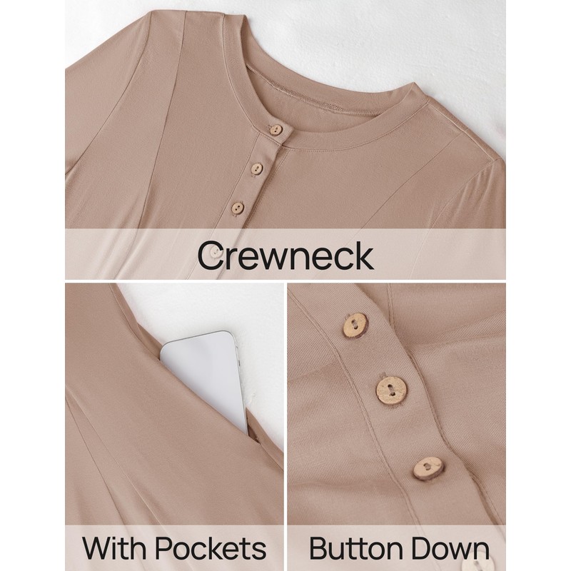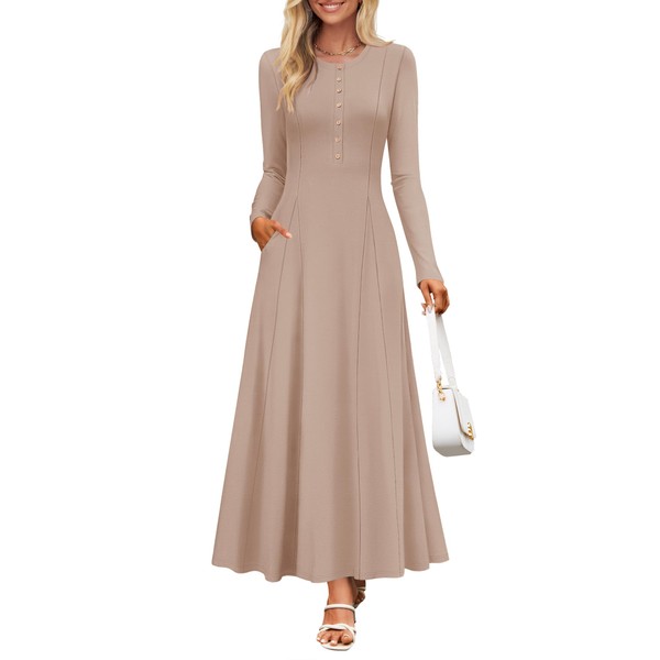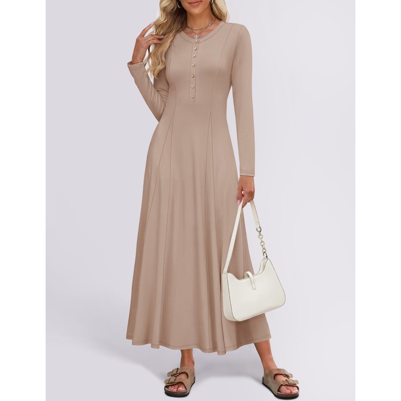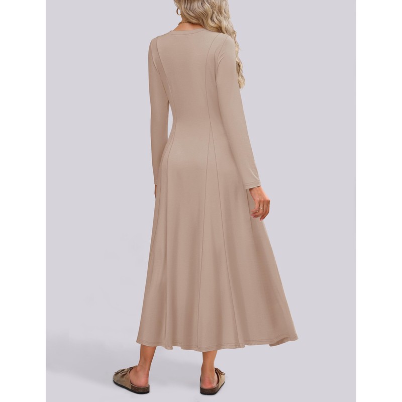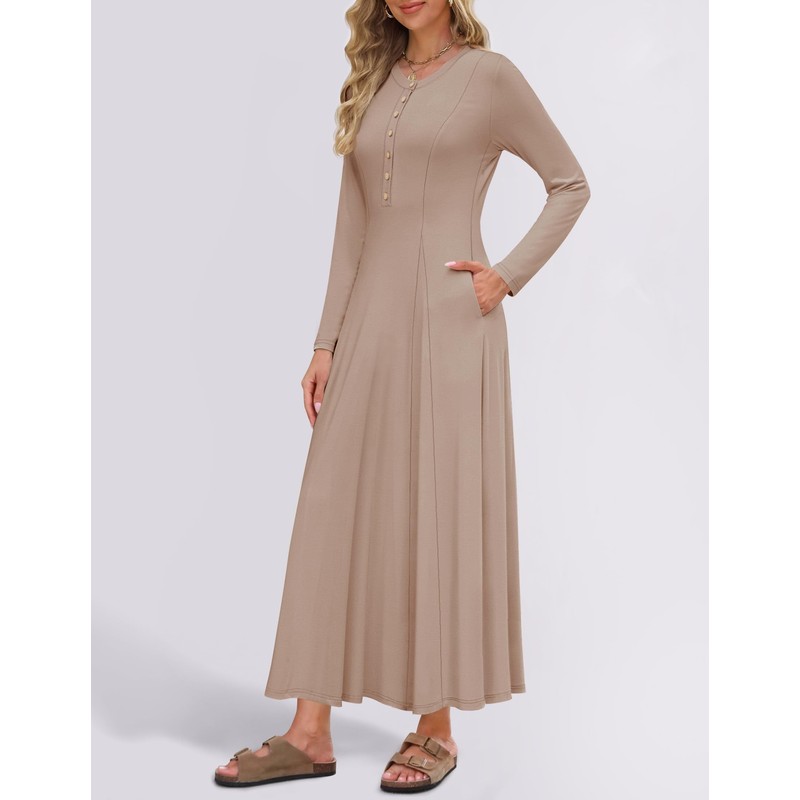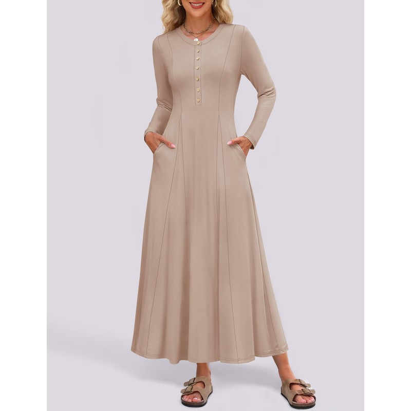 - Design: Women's maxi boho dress features long sleeve, casual button v neck, solid color, fit & flare swing hem gracefully flatters your curves! Side pockets and no zipper, you can style this dress with heels, earrings —making it a ideal pick for any look!