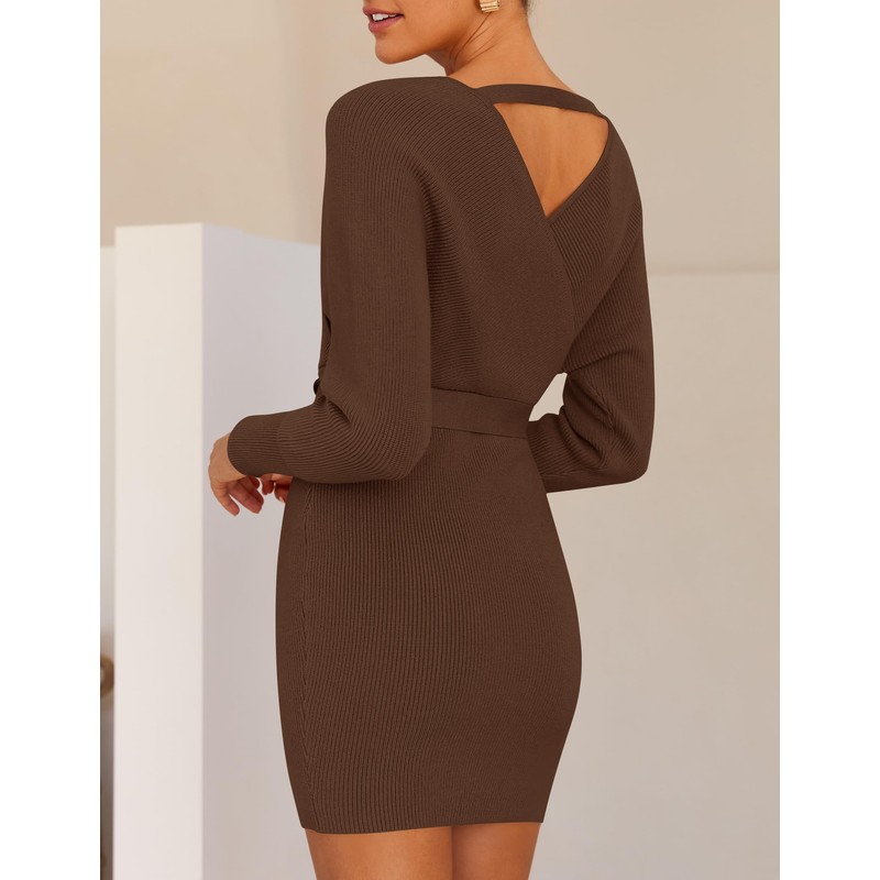 ZESICA Women's Fall Long Batwing Sleeve Wrap V Neck Knitted Backless Bodycon Pullover Sweater Dress with Belt,Brown,Medium