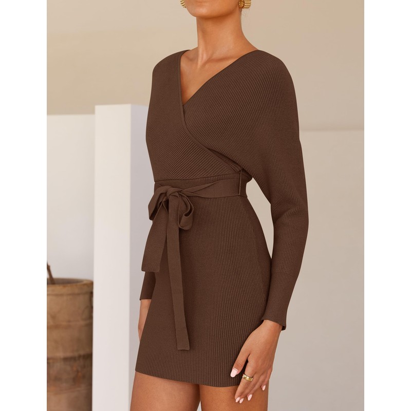 - Sexy wrap v neck, long batwing sleeve, adjustable waist belt, unique v design in front and back, solid color, slim fit, stylish knitted one-piece dress.