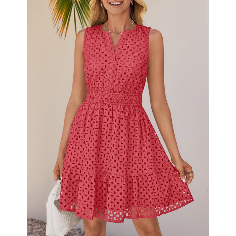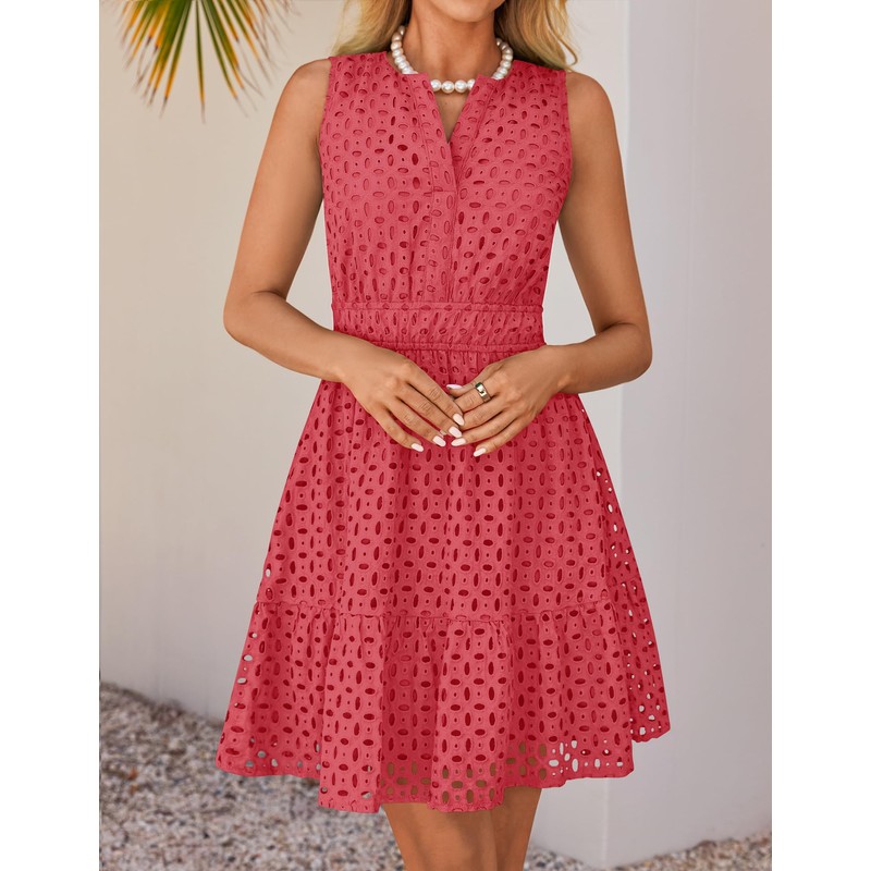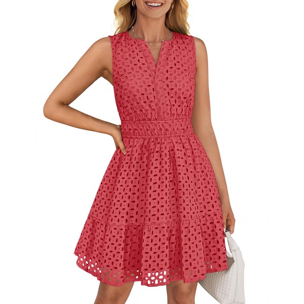 ZESICA Women's Summer Sleeveless Mini Dress V Neck Hollow Out Eyelet High Waist A Line Swing Short Party Dresses,Watermelon,Large