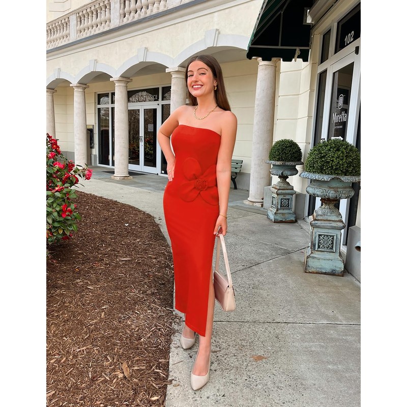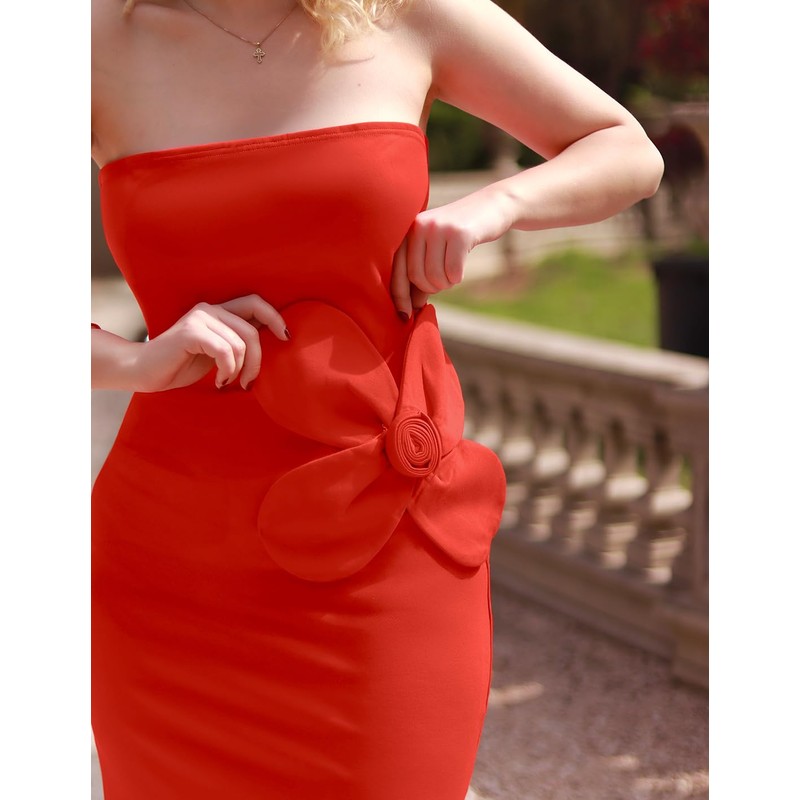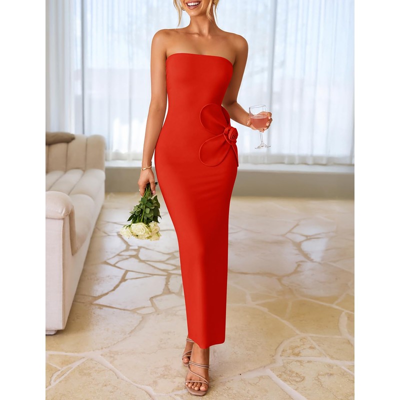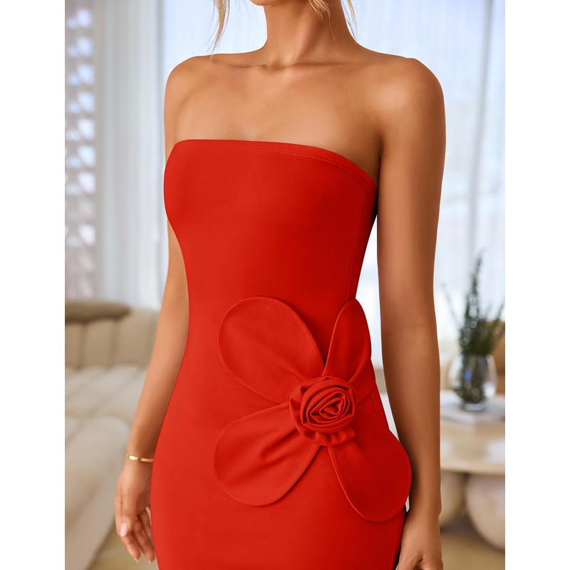 - Features: strapless, backless, floral deco on the waist, slim fit, midi length, no pockets, made of stretchy fabric, this trendy bodycon dress suitable for most body type