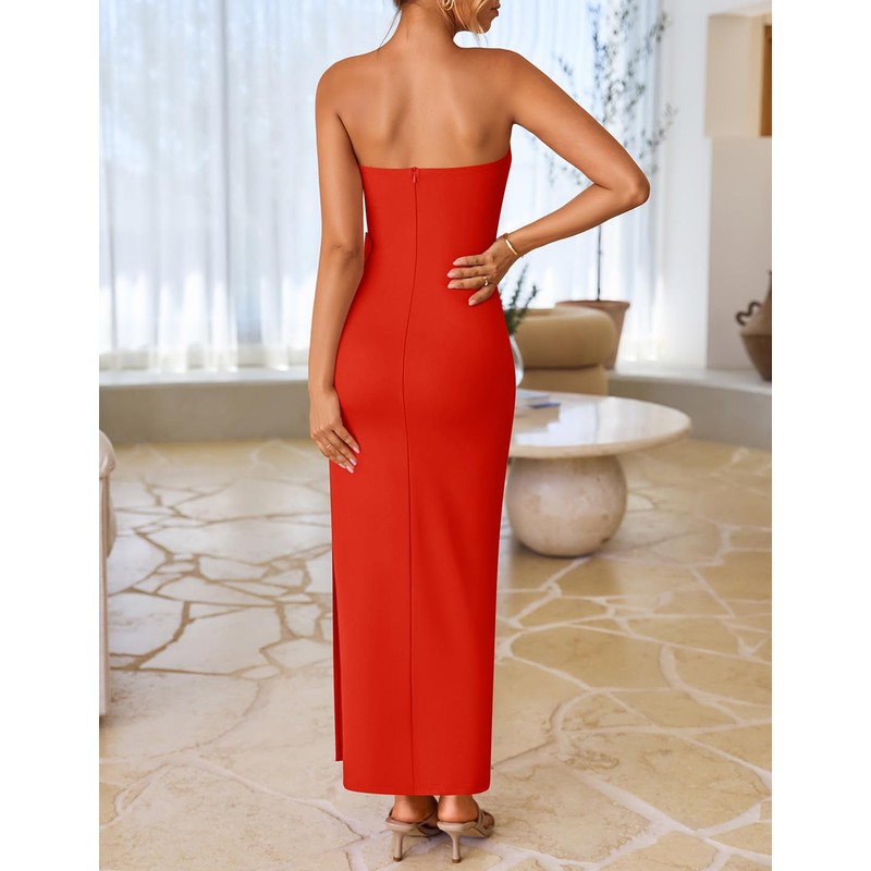ZESICA Women's Summer Strapless Bodycon Maxi Dress 2025 Ribbed Knit Backless Floral Tube Cocktail Party Long Dresses,Red,Large