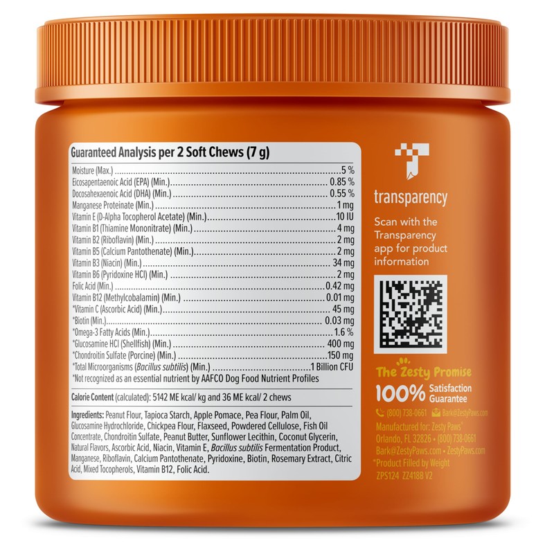 Zesty Paws Multivitamin Treats for Dogs, Glucosamine Chondroitin Joint Support + Digestive Enzymes & Probiotics, Grain Free Dog Vitamins and Supplements for Skin & Coat, Peanut Butter - 90ct