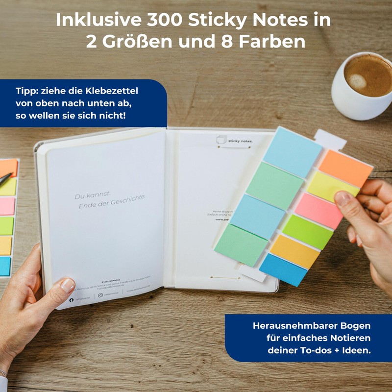 - Integriertes Kanban-Board im Notizbuch: To-do Organisation leicht gemacht – Mit dem ausklappbaren Kanban-Board und 300 Haftnotizen hast du all deine To-dos immer im Griff. Kein lästiges Multitasking mehr – Du kommst schneller ans Ziel, bist produktiver und hast alle To-dos immer im Blick.