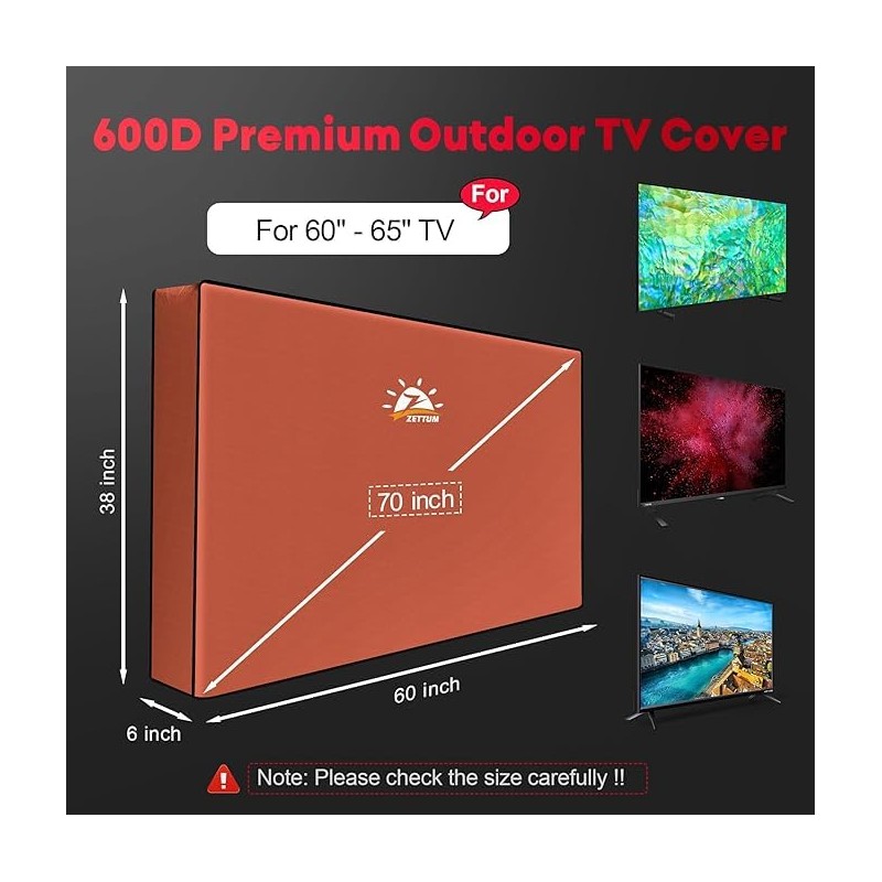 - Easy to install with great protection - Designed by our TV cover expert team, Zettum TV covers for outdoor use are very easy to install and remove. With the cover on your TV, no more worrying about the sunlight, rain, snow, wind, dust, resin, leaves, debris and bird droppings etc. Zettum will be the hard protector of your TV.