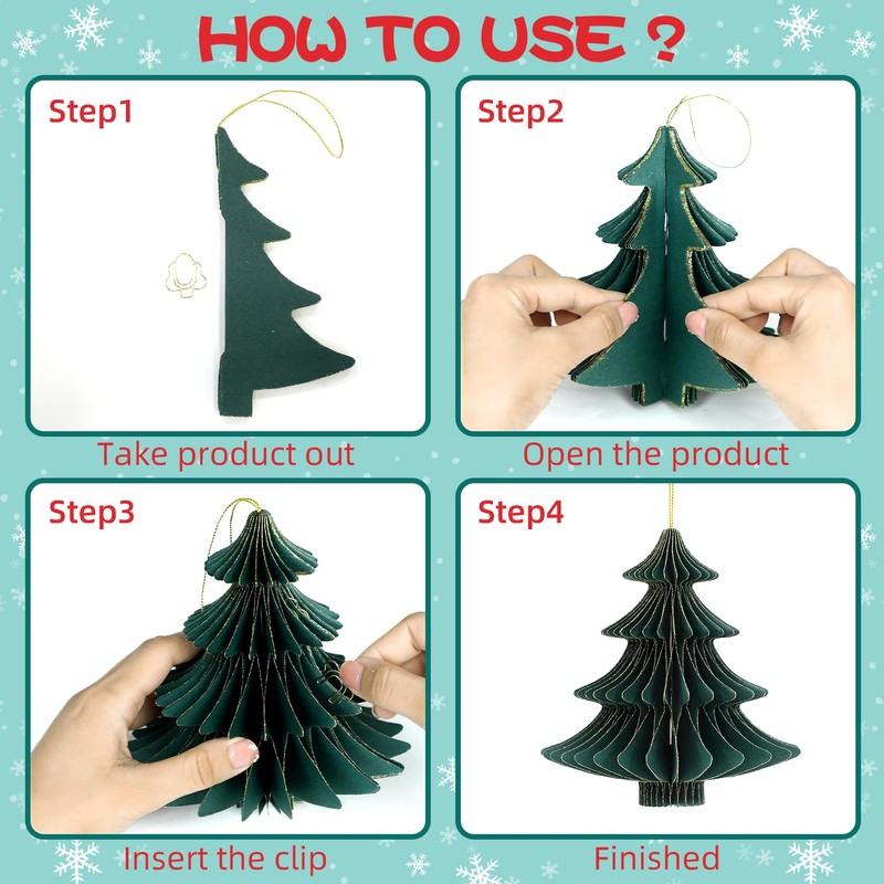 • Hassle-Free Setup: Unfold these paper ornaments, secure them with the included Christmas tree-shaped paper clips, and hang them with the provided strings. Plus, their reusability ensures their beauty lasts across multiple holiday seasons