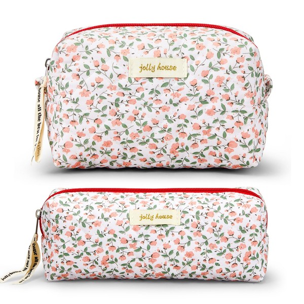 Zeyune 2 Pcs Quilted Makeup Bag Cotton Floral Cosmetic Bag Flower Makeup Brush Case Travel Cute Toiletry Bag Kawaii Floral Makeup Pouch for Women Cosmetics Storage (Classic Style)