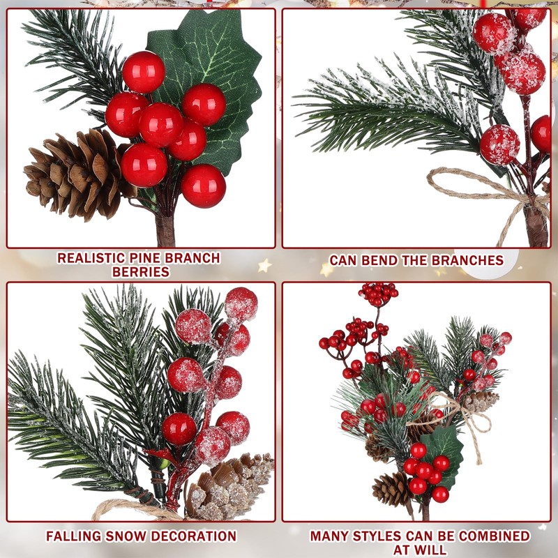 Zeyune 50 Pieces Christmas Floral Picks Christmas Artificial Snowy Red Berry Picks Stems Small Faux Faux Cedar Pine Needles Branche with Pinecones for Floral Arrangement Wreath Garland Greenery