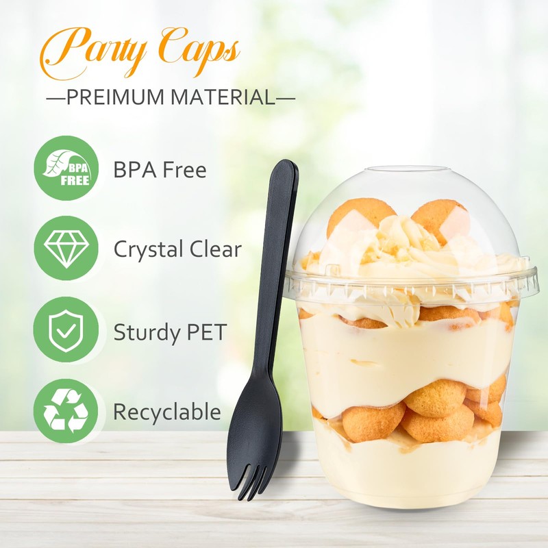 - GREAT VALUE PACK: The package includes 50pcs disposable plastic cups with dome lids (NO HOLE) and 50pcs plastic sporks for your convenience. 10 oz is the perfect size for parfait and fruits.