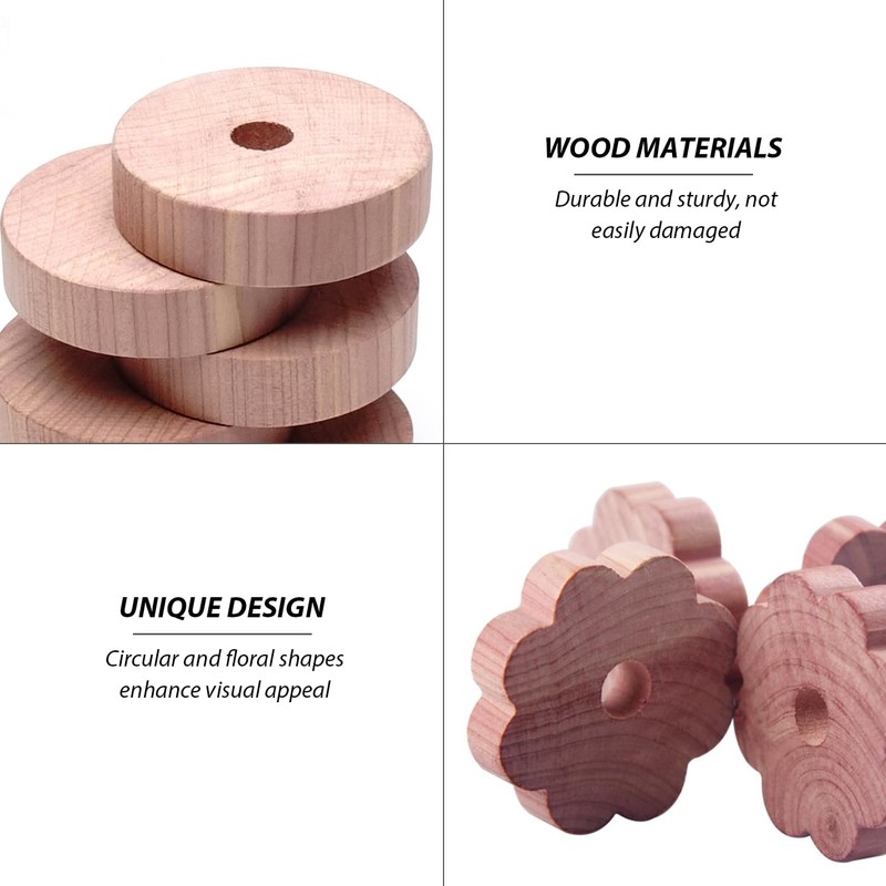 - Product contents: you will receive 30 moth-proof cedar wood blocks with a diameter of 4.8 cm and a thickness of 0.9 cm, including 15 round and 15 flower-shaped cedar wood blocks. Suitable for wardrobes, cupboards and storage boxes to prevent moth eating and keep clothes and furniture fresh and dry.