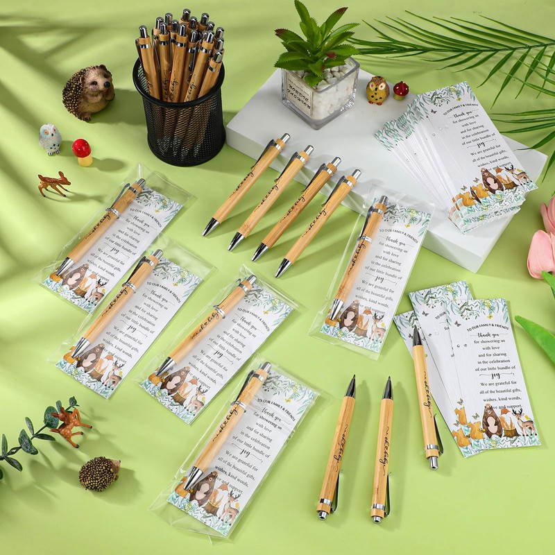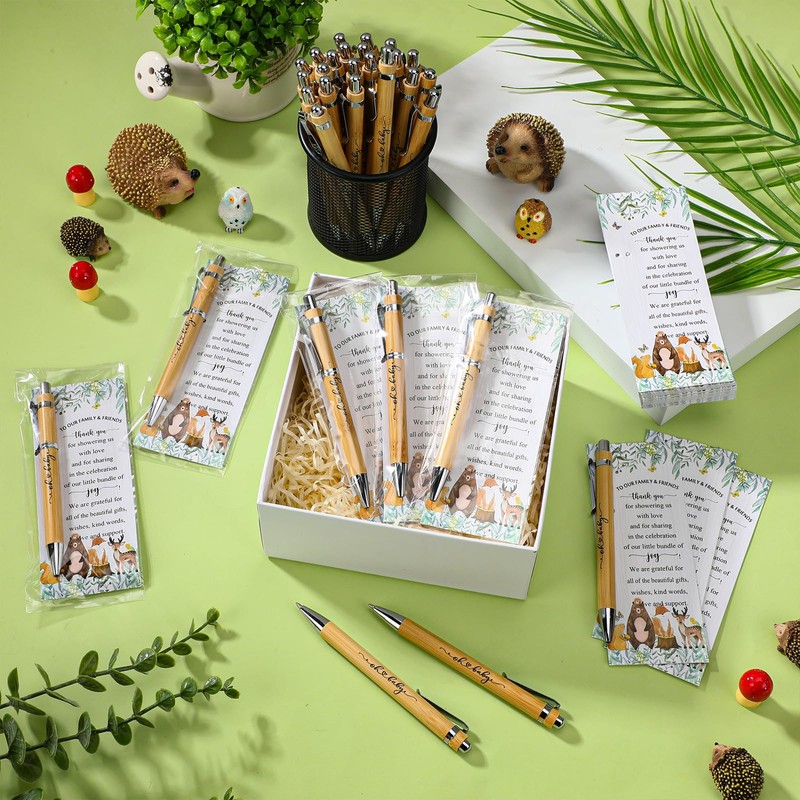 Zhanmai 50 Sets Woodland Animals Baby Shower Favors Include Bamboo Pens and Baby Shower Thank You Cards Cable Ties Woodland Decoration Gender Reveal for Guest Game Prizes Party Favors
