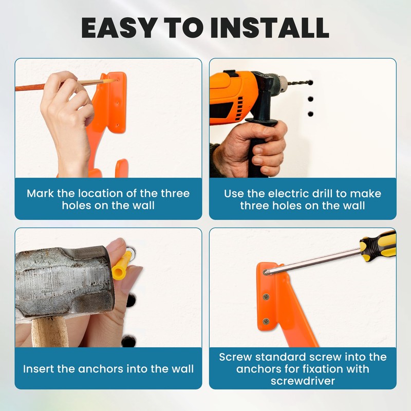 - 𝐄𝐚𝐬𝐲 𝐢𝐧𝐬𝐭𝐚𝐥𝐥𝐚𝐭𝐢𝐨𝐧 𝐢𝐧 𝟑 𝐬𝐭𝐞𝐩𝐬:Punch holes of the right size vertically in the wall, fasten the screw anchor into the hole, place the hole of the chainsaw hold frame against the hole in the wall and fasten the screw .