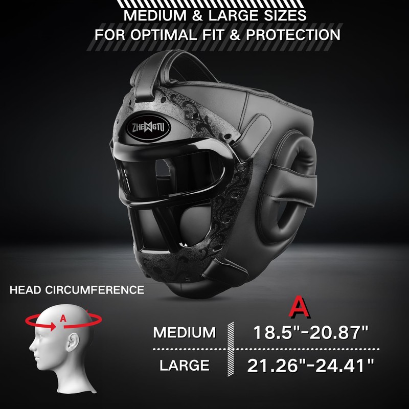 Introducing the ZHENGTU Boxing Headgear Protective Gear with Removable Face Grill - an adjustable martial arts helmet designed for a wide range of combat sports, including MMA, Muay Thai, BJJ, Kickboxing, Karate, and Taekwondo sparring. Available in medium and large sizes, this black headgear offers superior protection and comfort for all your training needs.