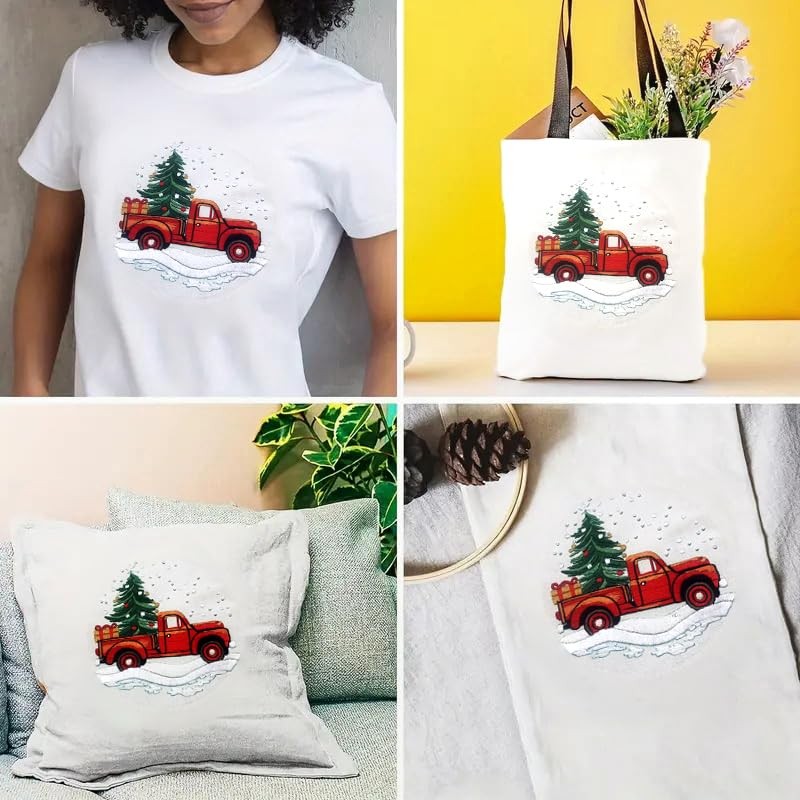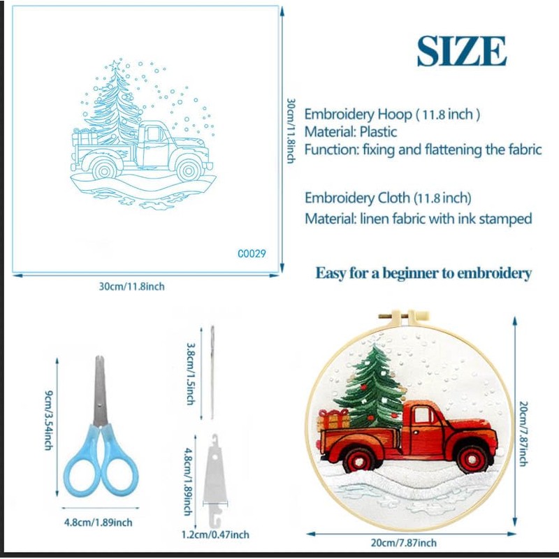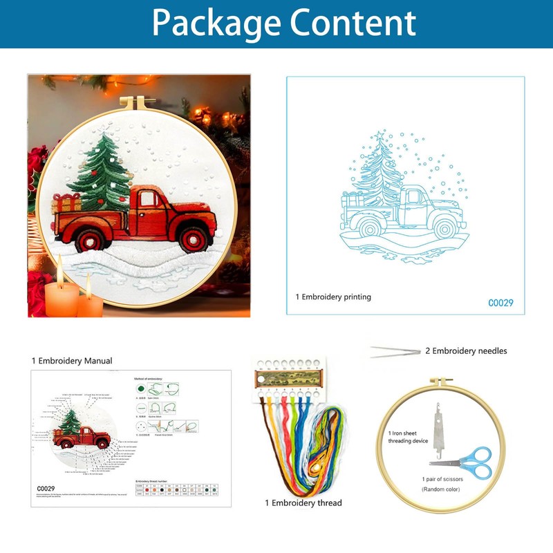 - Festive All-In-One Kit: Pre-printed 29x29cm fabric, 20cm hoop, needles, threader, scissors, threads + visual instructions.