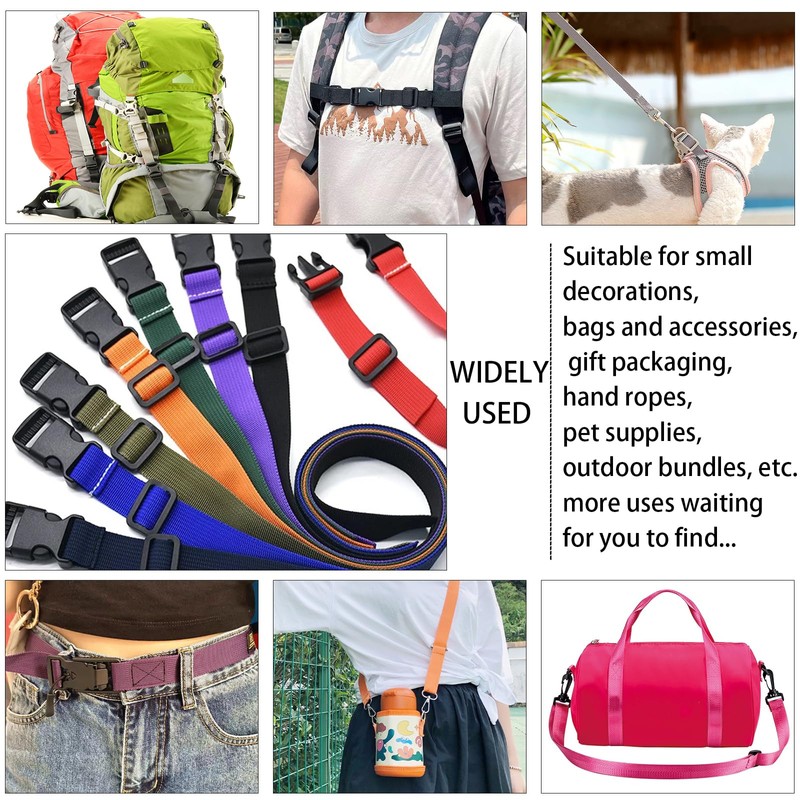 - 【COMBINE WITH BUCKLES】The package have been included: one roll of webbing straps and 2 sets of adjustable quick side plastic buckles, 4pcs anti-slip tri-glide silde clips. It can help you to make DIY projects.