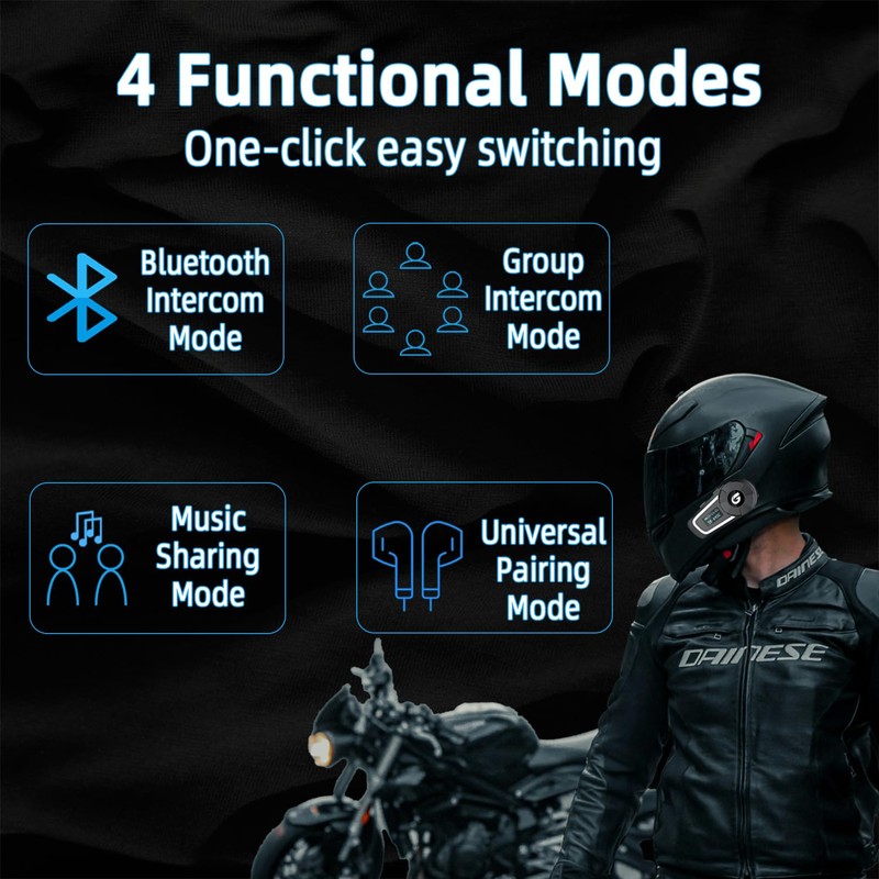 4 functional modes:Bluetooth Intercom Mode/Bluetooth Group Intercom Mode/Music Sharing Mode/Universal Pairing Mode
