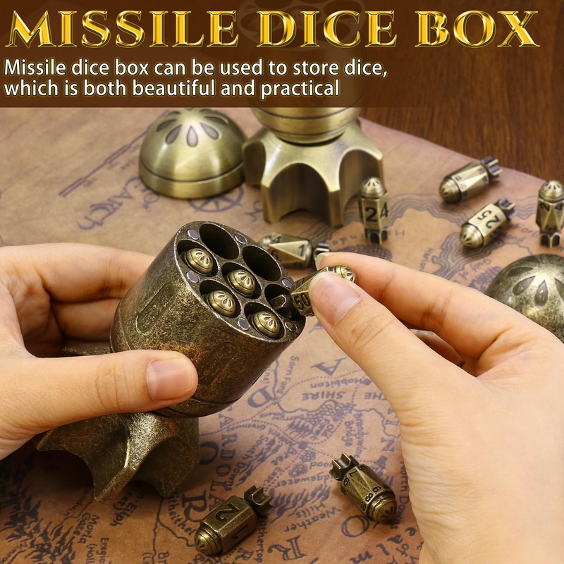 - 𝑼𝒏𝒊𝒒𝒖𝒆 𝑴𝒊𝒔𝒔𝒊𝒍𝒆 𝑫𝒊𝒄𝒆 𝑺𝒆𝒕: ZHOORQI Missile DND Dice are a combination of role-playing games and marvelous technology. These metal dice have a cool missile-shaped design that adds a distinctive flair to any tabletop gaming session