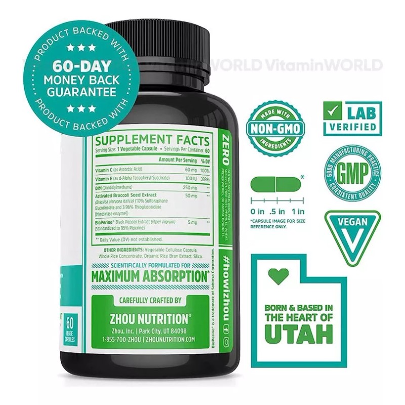 - Valores nutricionales por porción: Bioperina5mg,DIM250mg,ExtractoBrocoli50m,Vitamina C 100 mg,VitaminaE100IU