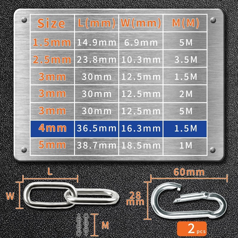 - Package contents: Ziamzra has prepared a steel chain sold by the metre with a length of 1.5 m and a thickness of 4 mm, equipped with 2 safety buckles 6 x 60 mm, which can fix and lock stainless steel chain perfectly. Durable and long use.