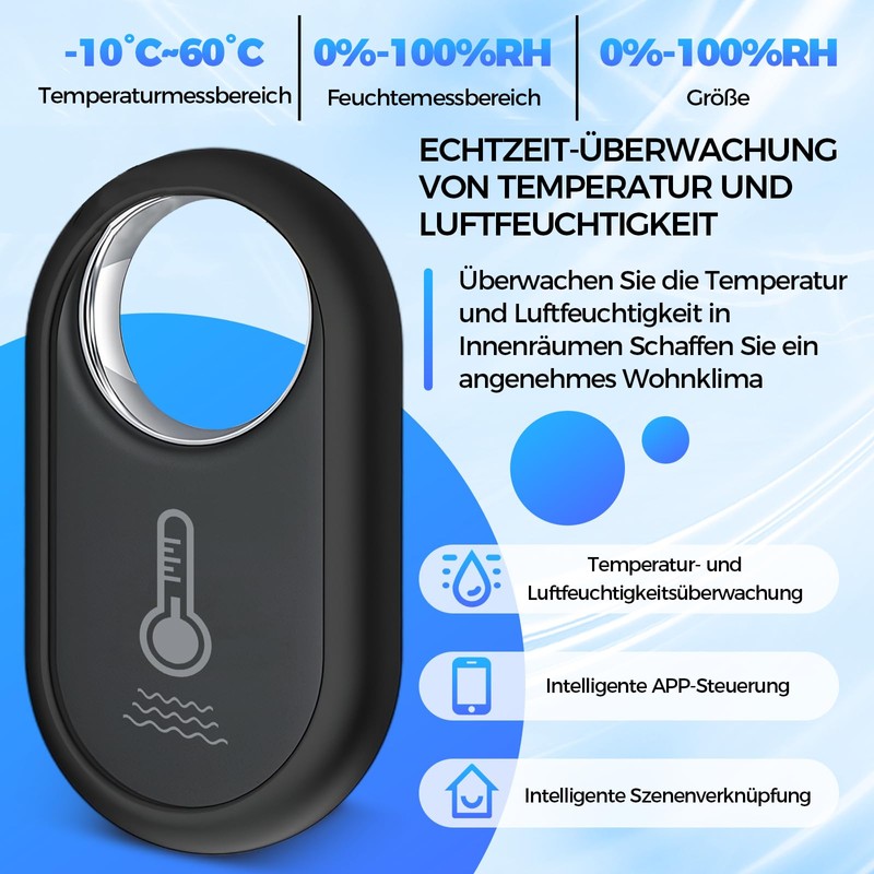 Automatische intelligente Verknüpfung: Sie können ein Verknüpfungsszenario erstellen. Wenn die Temperatur und Luftfeuchtigkeit den voreingestellten kritischen Wert erreichen, starten und stoppen Sie automatisch Klimaanlagen, Luftbefeuchter und andere Geräte (die Ausrüstung muss die Verknüpfung unterstützen).</br>