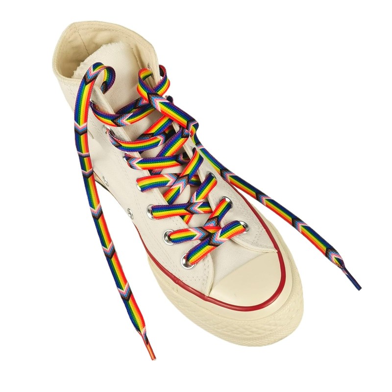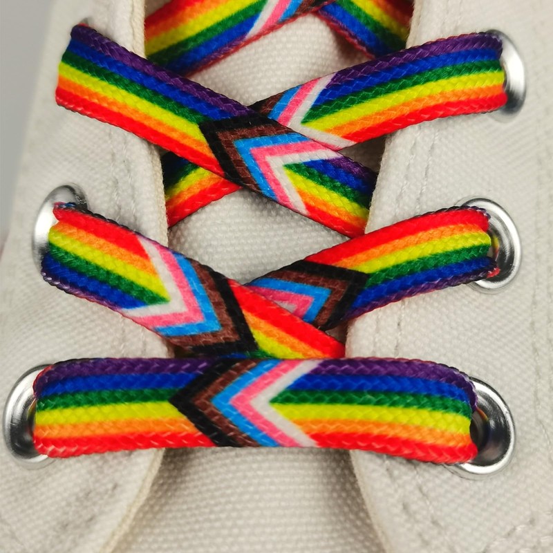 - Progress Flag Color Shoelaces: Show off your pride with our flat-styled, high-quality, woven shoelaces with a Progress pride flag design.