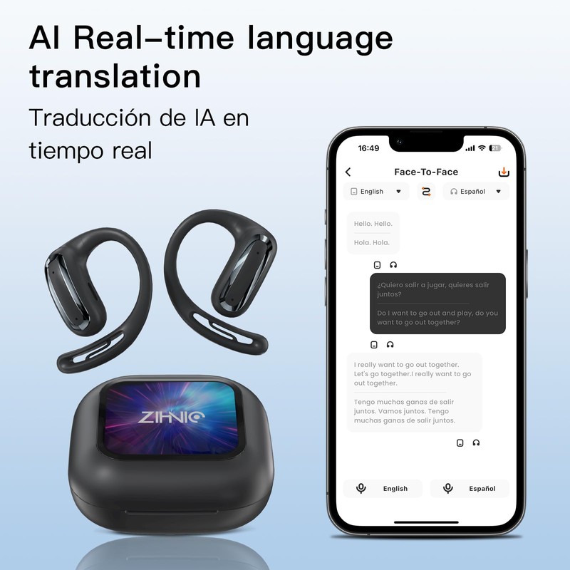 - Traducción de lenguaje en tiempo real: los auriculares ZIHNIC S16A multimodo están equipados con tecnología avanzada de traducción que permite traducción de lenguaje bidireccional en tiempo real, por lo que es la solución perfecta para superar barreras de idioma durante reuniones de negocios, viajes o cualquier situación en la que la comunicación clara sea esencial, asegurando conversaciones fluidas y precisas sin demora.