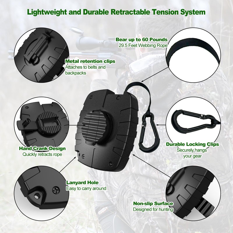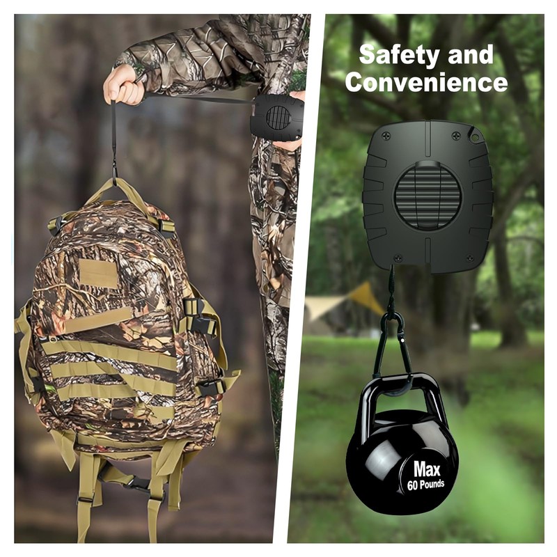 • Easy To Use: Simply attach the hook to your bow or gear and clip the clip on the back of the gear hoist to your harness or put it in your pocket. The rope automatically unfolds as you climb, and you can easily pull up and retrieve your gear once you reach the top