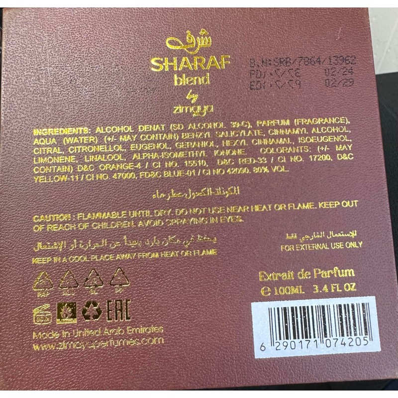 • Sharaf Blend Extrait De Parfum Spray 100ML by ZIMAYA Sharaf Blend - A rich and captivating aroma, this fragrance is perfect for anyone who wants to feel sophisticated and alluring.