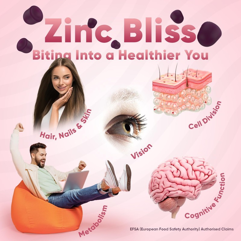 - FOR A GLOWING & HEALTHY YOU: Zinc is a trace mineral essential for almost 100 enzymes in our body. As our body doesn't naturally produce or store Zinc, we must obtain it through foods and supplements. Zinc contributes to maintaining normal hair, nails, skin & bones. It contributes to the maintenance of normal vision. Zinc contributes to the normal function of the immune system. It also contributes to the protection of cells from oxidative stress (EFSA Claims).