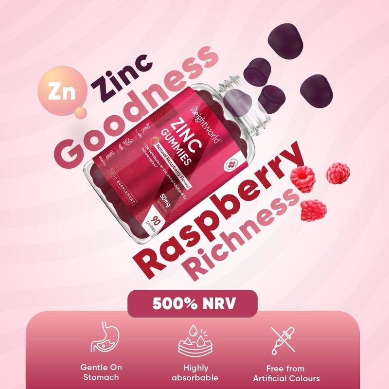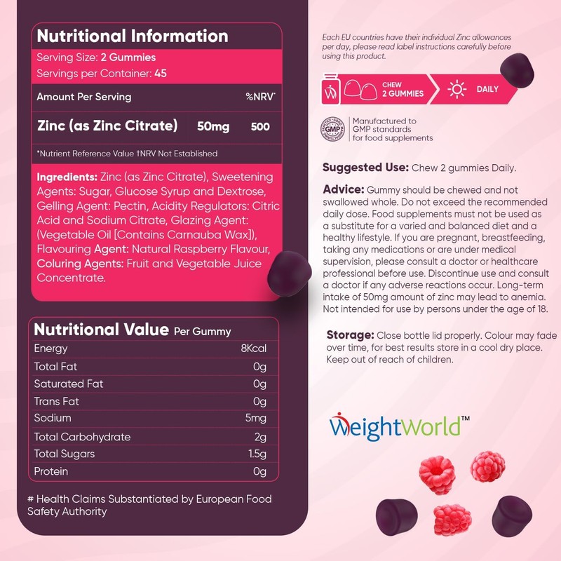 - WHY WEIGHTWORLD'S ZINC GUMMIES?: Looking forward to incorporating Zinc Supplements into your lifestyle? Our delicious yet nutritious Zinc Gummies will help you make it a treat for yourself! Each gummy offers you 25mg of Zinc as Zinc Citrate (with two gummies providing you 50mg), one of the most bioavailable & easy absorbing forms of Zinc compared to other forms. You can consume 2 of our Zinc 25mg gummies to get 50mg. These gummies are gentler on the stomach than other Zinc Supplement forms like Zinc Acetate or Zinc Glycinate.