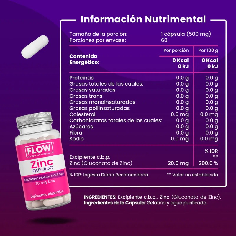 Zinc Quelado 200 Mg 60 Cápsulas De 500 Mg Flow